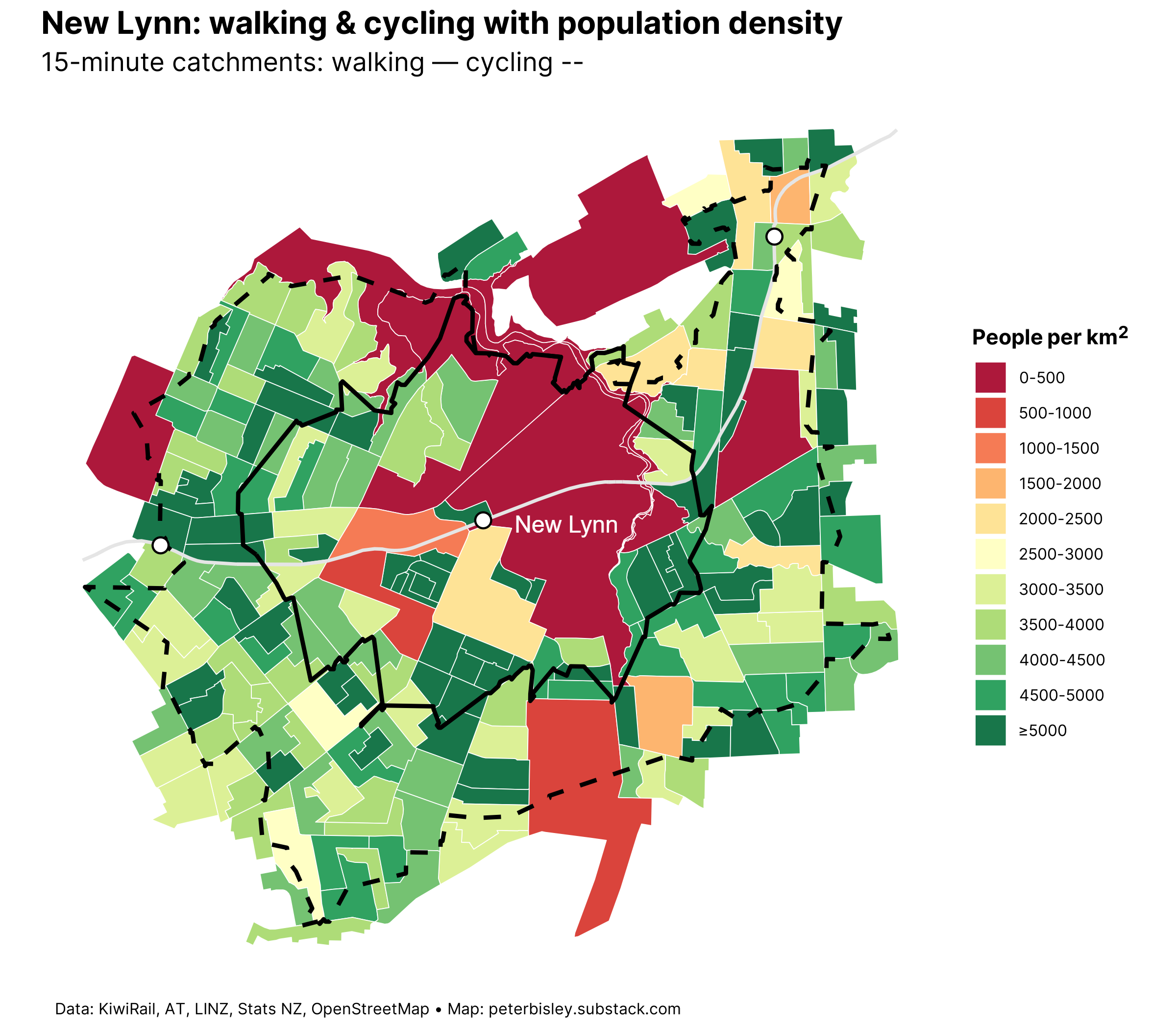 New Lynn, the major transport hub on the Western Line, shows a similar development pattern to Henderson, with significant proportions of the area close to the station having a low density. The 15-minute walk catchment of New Lynn station are 7500 people and 2.7 km², increased to 24,100 and 7.1 km² with cycling.